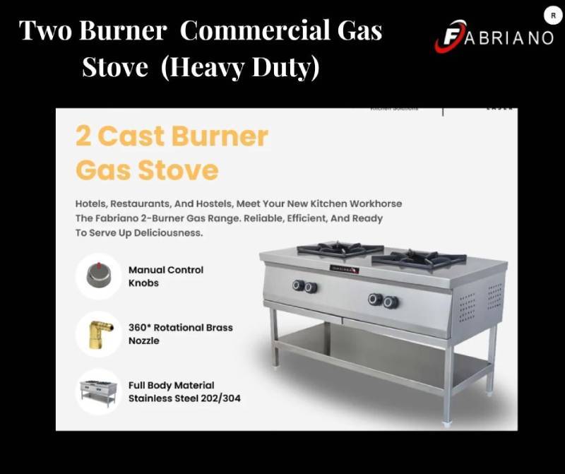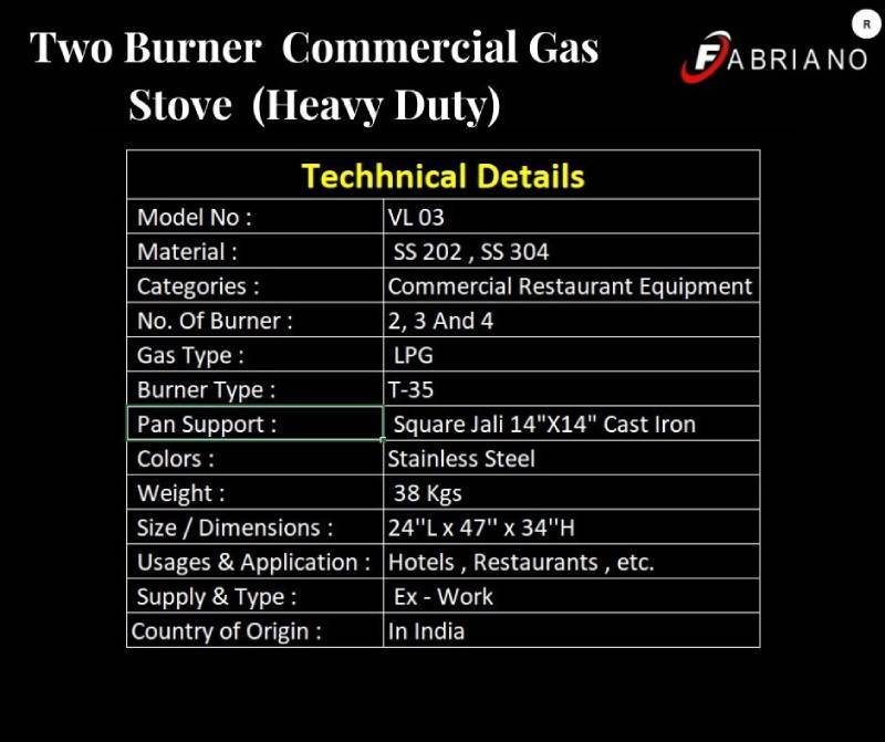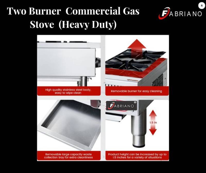 Two Burner Commercial Gas Stove – Heavy Duty is a testament to meticulous engineering and quality manufacturing. Its sturdy construction, utilizing premium stainless steel materials, ensures longevity in demanding commercial kitchen environments. The inclusion of T-35 burners and a robust cast iron square jali pan support guarantees even heating and steadfast stability while accommodating various cookware sizes.